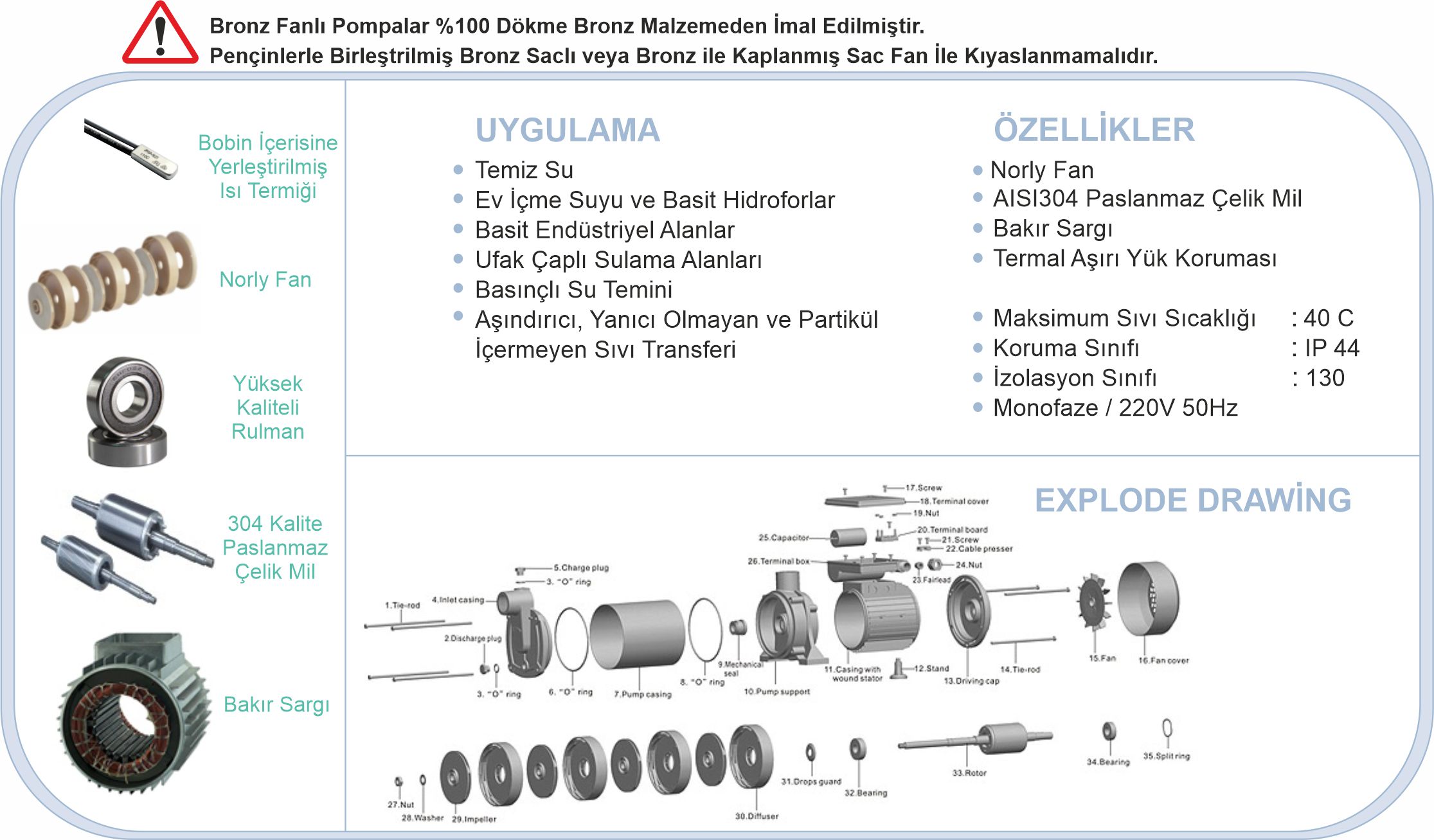 Çok kademeli yatay milli pompalar damla sulamalarda, sanayide, arıtma sistemlerinde, bahçe fiskıye sistemlerinde, benzin istasyonlarında, araç yıkama istasyonlarında ve basınçlı su ihtiyacına yönelik hidrofor amaçlı kullanılan pompalardır. Norly çark, paslanmaz çelik mil, bakır sargı kullanılan malzemelerdein özellikleridir. Maksimum sıvı sıcaklığı 40 derece olup monofazedirler.